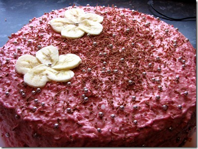And then the third layer was put on, and the whole cake covered with more strawberry cream. I then decorated with a bit of chocolate shavings, silver pearls, and flowers made from banana.